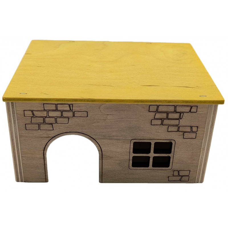 Drewniany domek dla gryzoni który zapewnia im schronienie i poczucie bezpieczeństwa.