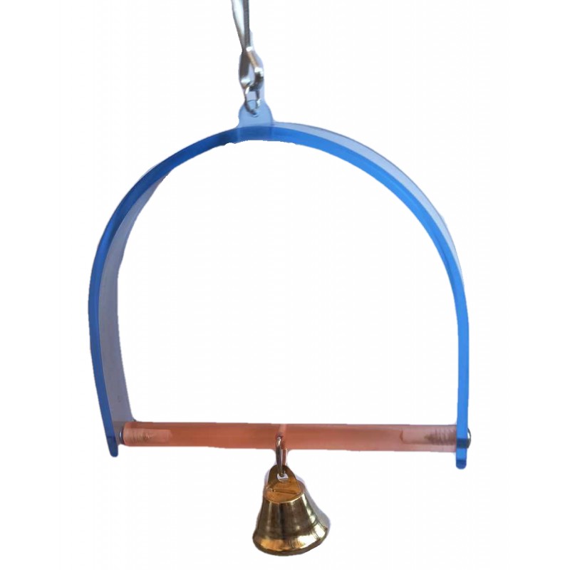 Huśtawka dla ptaków, wykonana z akrylu i wyposażona w metalowy dzwonek.